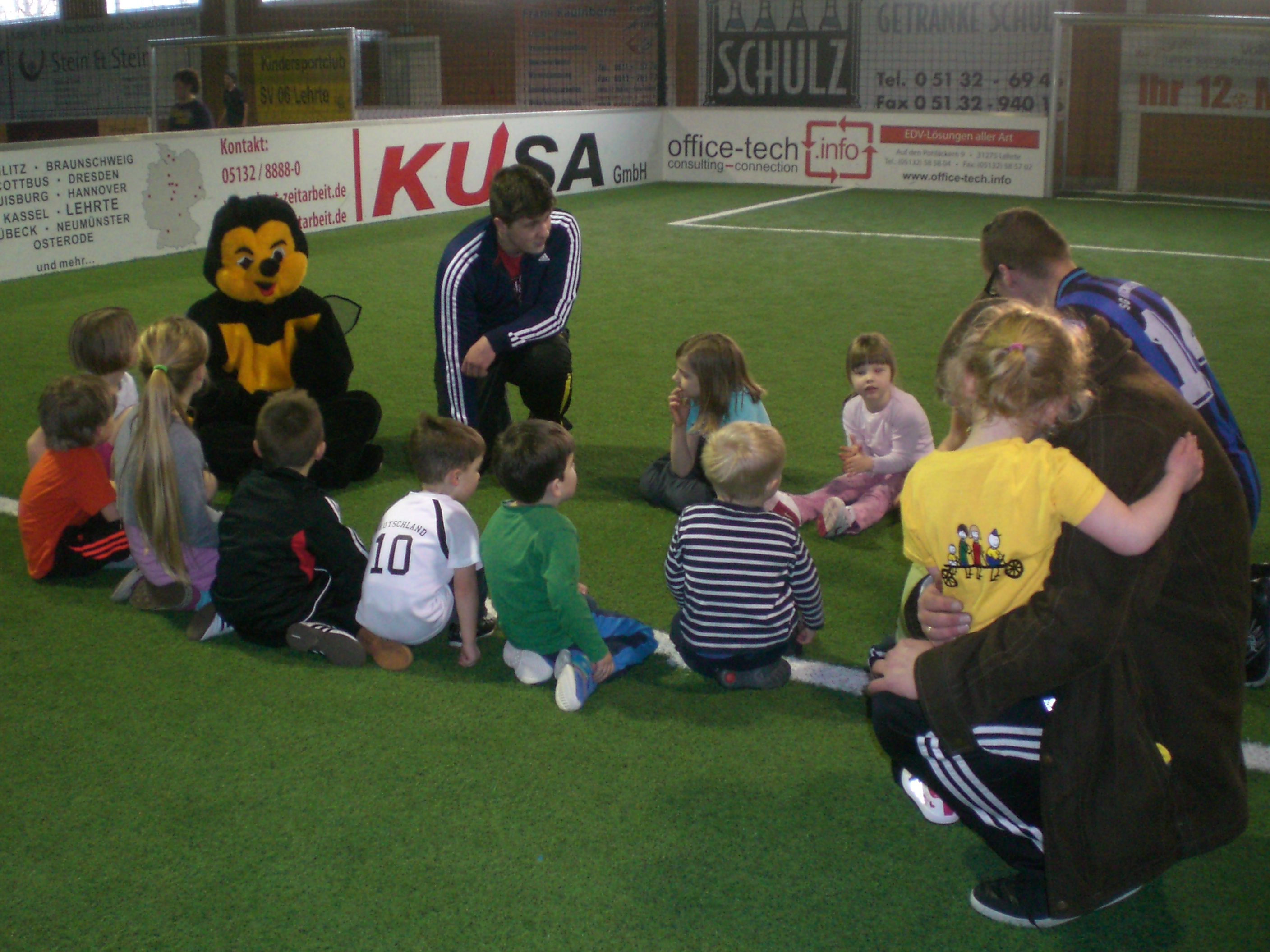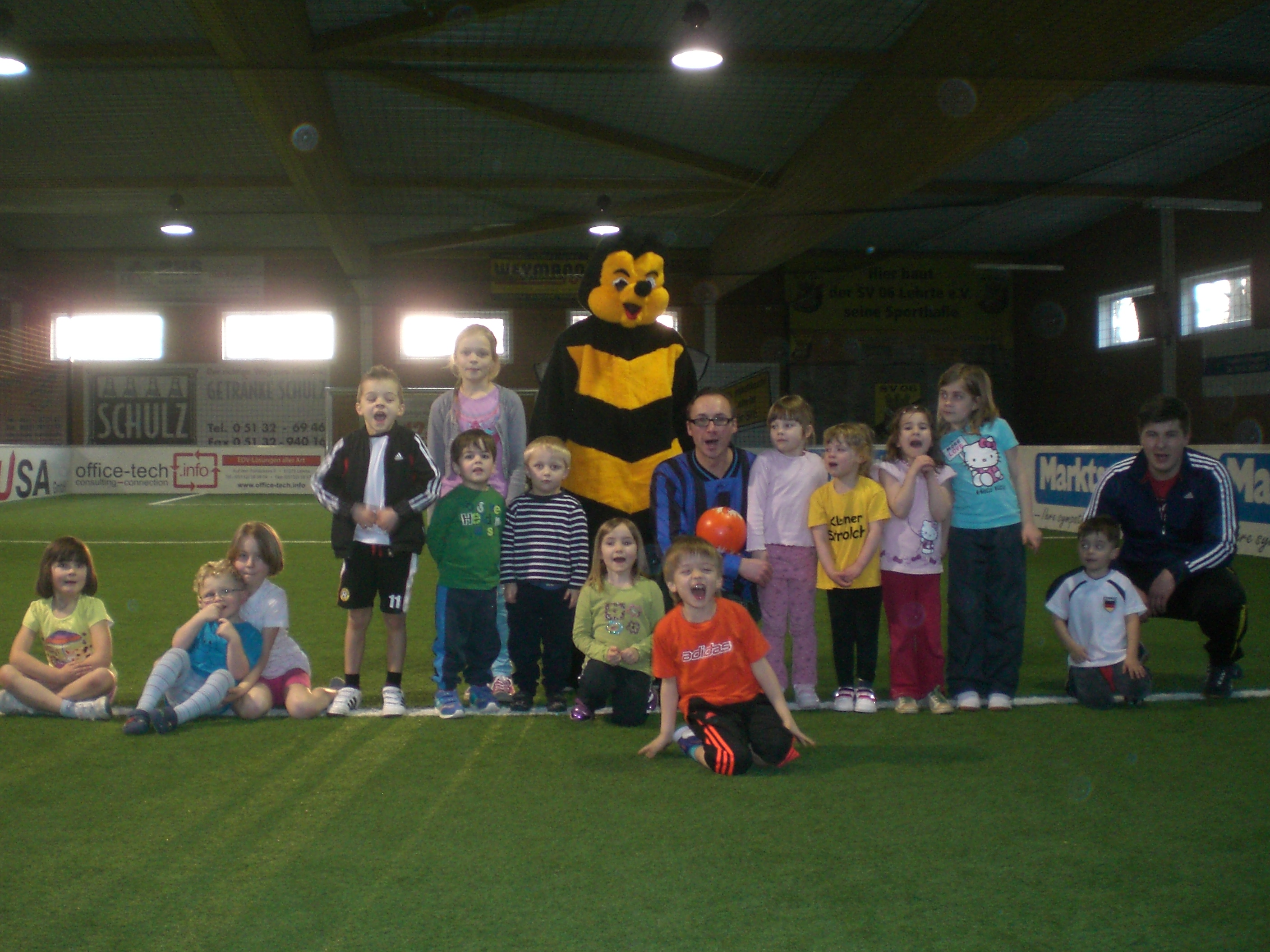 Über 15 Jungen und Mädchen zwischen drei und sechs Jahren wurden von Leroy und Sebastian herzlich begrüßt.Das Maskottchen des Kindersportclubs, unsere Biene Maja, war aber der eigentliche Star der Sportstunde.