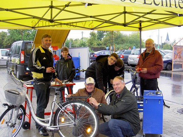 Die Crew des SV 06 Lehrte ließ sich von dem schlechten Wetter nicht beeindrucken. Unter dem Schutz des gelb-schwarzen Pavillions schraubten sie unverdrossen weiter, bis sich kein Radfahrer mehr heraus traute. Allen Beteiligten hat die Aktion großen Spaß gemacht, eine Wiederholung ist gewiss.