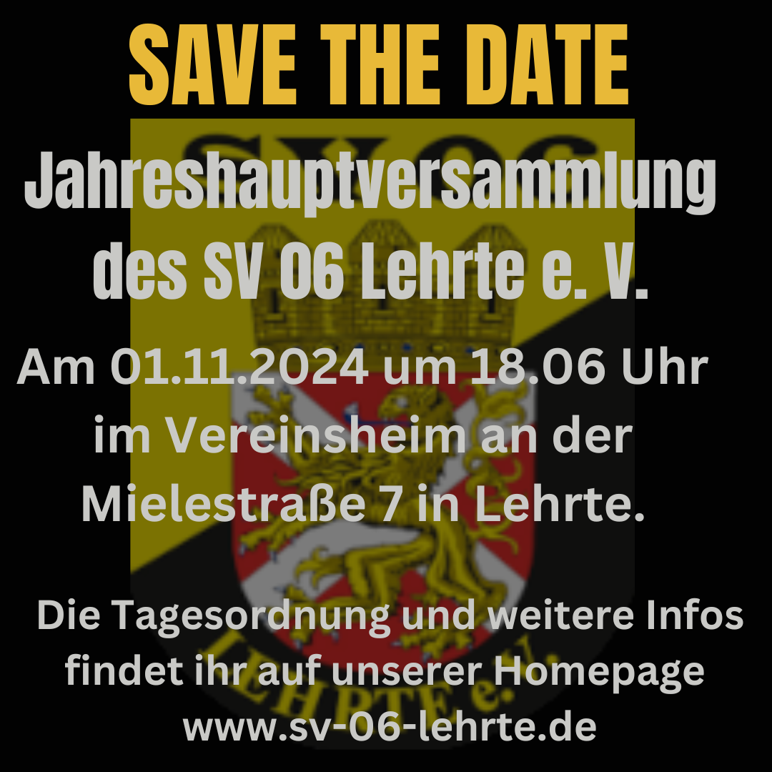 Am Freitag, den 01.11.2024 findet die diesjährige Jahreshauptversammlung des SV 06 Lehrte e.V. im Vereinsheim an der Mielestraße 7 in Lehrte statt. Seit der letzten Versammlung im November 2023 ist im Verein wieder viel passiert. Gern möchten wir unseren Mitgliedern die Gelegenheit geben, sich über die aktuellen Geschehnisse beim SV 06 Lehrte zu informieren. Auch Neuwahlen stehen auf dem Programm. Wer sich für ein Vorstandsamt interessiert, kann sich gern bei einem unserer Vorstandsmitglieder melden. Die Tagesordnung stellen wir Euch hier entsprechend zur Verfügung.