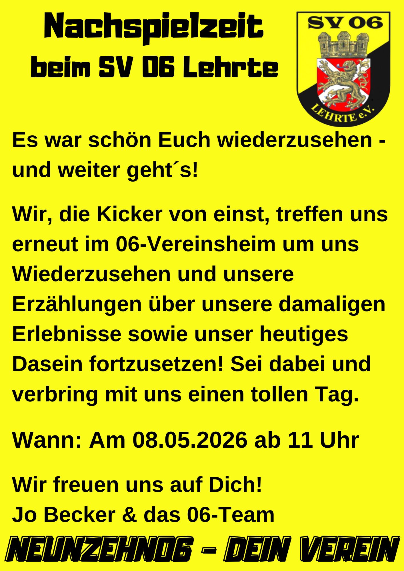 Der SV 06 Lehrte e. V. lädt seine ehemaligen Spieler, heute Senioren, erneut zu einem gemütlichen Beisammensein am 08. Mai 2026 ab 11 Uhr ins Vereinsheim in der Mielestraße 7 in Lehrte ein.