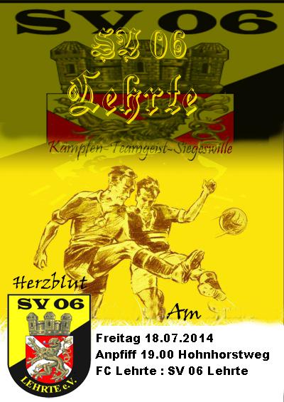 Testspiel - Derbytime FC Lehrte : SV 06 Lehrte An diesem Freitag den 18.07.2014 kommt es zu einem interessanten Testspiel zwischen unserer 1. Herren und dem FC Lehrte. Anpfiff der Partie ist um 19.00 Uhr auf der Anlage des FC Lehrte am Hohnhorstweg.