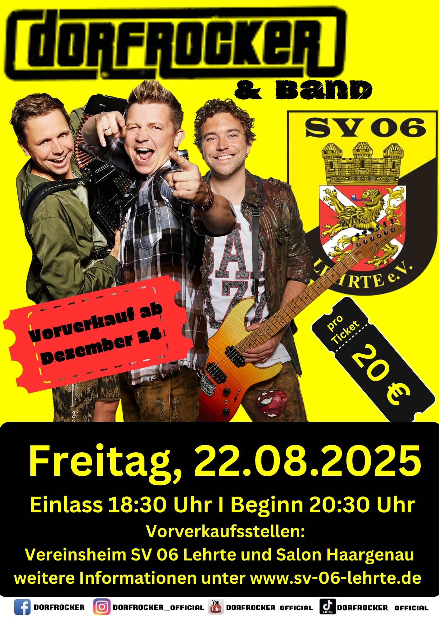 Am Freitag, den 22.08.2025 begrüßen wir Euch auf unserem Vereinsgelände in der Mielestraße ab 18.30 Uhr zum nächsten Großevent. Die "Dorfrocker & Band" kommen zu uns nach Lehrte.