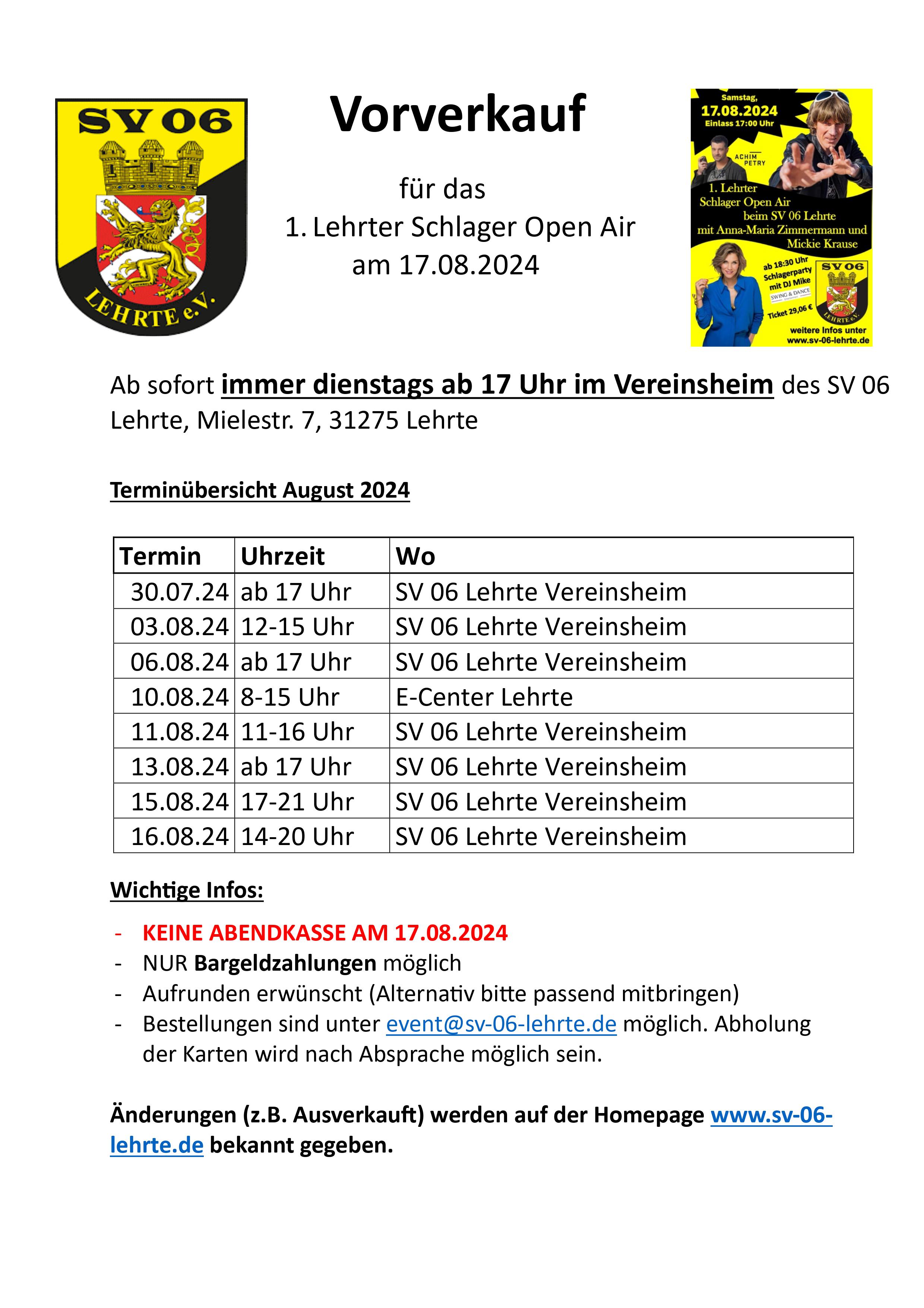 Aufgrund der guten Ticket-Verkaufszahlen hat der SV 06 Lehrte e.V. für das 1. Schlager-Open-Air am 17.08.2024 auf dem Vereinsgelände an der Mielestraße 7 einen weiteren Schlagerstar verpflichtet. Neben Anna-Maria Zimmermann und Mickie Krause wird nun auch Achim Petry, Sohn des legendären Wolfgang Petry im August 2024 dabei sein. Nina Sievers, Hauptorganisatorin der Veranstaltung konnte dies jetzt überglücklich verkünden: „Wir konnten bereits über 1500 Karten verkaufen und wollen für Lehrte ein richtiges Highlight bieten. Da wir als Verein mit der Veranstaltung keinen kommerziellen Gedanken verfolgen, haben wir nun mit dem Schlagerstar Achim Petry einen weiteren Publikumsmagneten verpflichten können, hoffen natürlich, dass wir hierdurch noch weitere Karten absetzen können. Achim Petry wird sicherlich auch einige Songs seines Papas Wolfgang präsentieren, sodass gerade unsere älteren Besucher Spaß an der Veranstaltung haben werden. Da unser Verein ja auch auf Nachwuchs setzt, haben wir auch noch den bisher wenig bekannten Schlagersänger Thomas Sterner verpflichten können, sein übersandtes Video hat uns überzeugt und wir wollen diesem Nachwuchskünstler auch die Möglichkeit der Präsentation bieten.“ Wir sind uns sicher: Das wird die tollste Sommernachtsparty, die es in Lehrte je gegeben hat! Die zivilen Getränkepreise werden die tolle Party abrunden.